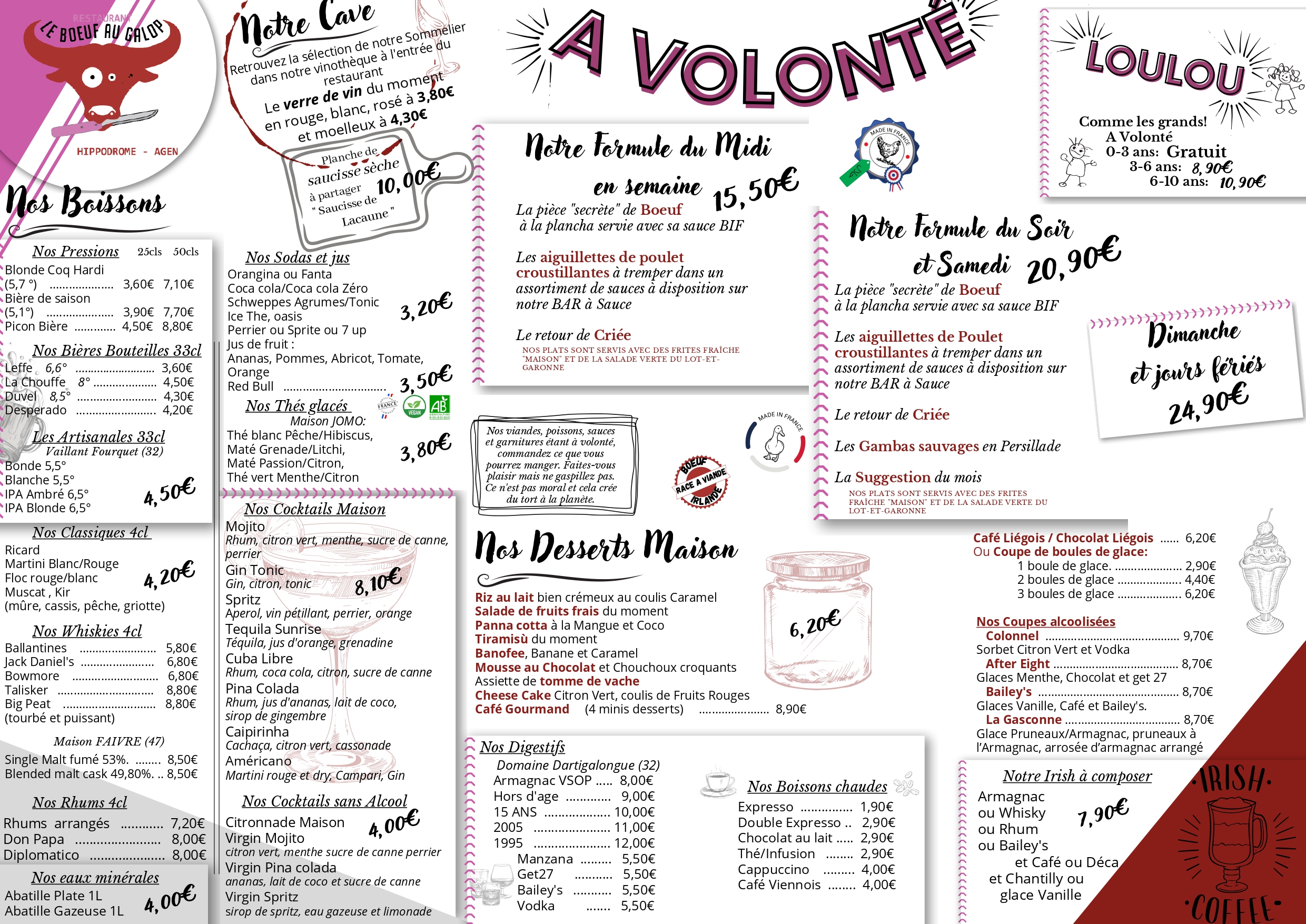 Quel est le concept ? Le Boeuf au Galop vous propose de choisir l’un de nos plats (ou plusieurs) : pièce « secrète » de boeuf français, aiguillettes de poulet croustillantes, gambas, canard. Votre plat est accompagné de frites fraîches maison et/ou de salade verte du Lot-et-Garonne.
